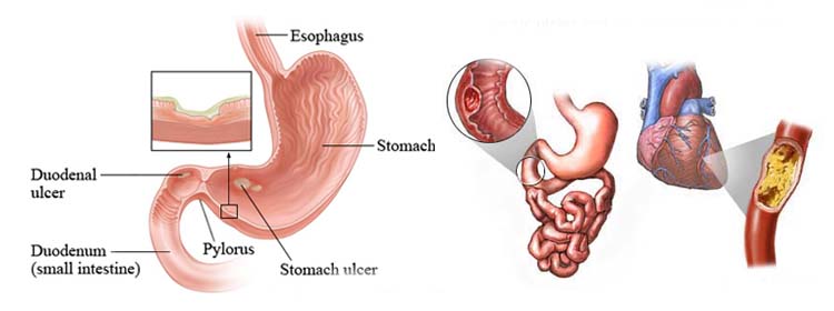 Ulcers in the duodenum are more common than gastric ulcers.Duodenal ulcers can cause bleeding or sometimes gastric outlet obstruction causing persistent vomiting.